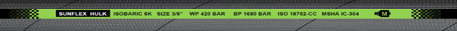 APPLICATION: PETROLEUM BASED HYDRAULIC FLUIDS AND OILS FITTINGS: M SERIES INNER TUBE: BLACK, OIL RESISTANT SYNTHETIC RUBBER TEMP RANGE: -40°C - 121°C REINFORCEMENT: FOUR AND SIX WIRE HIGH TENSILE STEEL WIRESPIRAL LAYERS IMPULSE CYCLES: 1,000,000 COVER: WRAPPED ABRASION, OZONE, OIL AND WEATHER RESISTANT SYNTHETIC RUBBER BRANDING: SUNFLEX HULK ISOBARIC 6K WP 420 BAR BP 1680 BAR ISO18752-CC MSHA IC 304