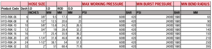 RESILIENT 6-WIRE SPIRAL CONSTRUCTION HIGH PRESSURE HIGH IMPULSE The Sunflex Total Core R6K spiral hose provides 6000psi constant working pressure in sizes -6 to -32 designed for harsh Australian conditions where high pressure high impulse applications are required. Half bend radius of regular R15, making it easy for installation this hose exceeds ISO 18752-CC uses M series fittings • ½” Iso 18752-Cc Half Bend Radius • 6,000 PSI Constant Working Pressure • 4 and 6 Wire Spiral Construction • 1,000000 Impulse Cycles • Code Match Hose and Fitting System • Super Tough Wrapped Cover Finish • The Most Flexible Hose on the Market • 4:1 Safety Factor