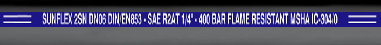 SAE 100 R2AT EN853 2SN Sunflex Total Core Magnum R2S is the industry leading R2AT hose. Although a multi-purpose hose, the Two wire extra flex design makes it the number one choice especially in mining and agriculture sectors. This hose exceeds SAE R2AT and is designed to meet the harsh Australian conditions. Uniquely patterned with a smooth cover and a distinctive royal blue finish-makes the R2S easy to identify with also an added feature of being flame proof and MSHA approved.  • Exceeds SAE Din spec  • Innovative Extra Flex design • 200,000 impulse cycles  • Easy identification with distinctive royal blue lay line • K Series fittings • Code matched hose and fitting system  • MSHA Approved • Flame Resistant • 4:1 Safety FactorÂ