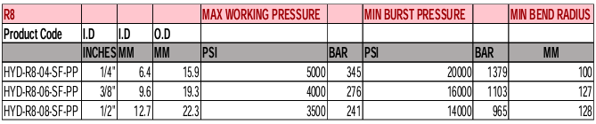 SAE 100 R8 (THERMOPLASTIC HOSE) The Sunflex R8 Thermoplastic Hose is an all-purpose medium pressure hose, suitable for numerous hydraulic and pneumatic systems. Compatible with hydraulic oils, grease, fuel oils, mineral oils and most phosphate esters. For water and water-based hydraulic fluids, temperature is limited to 70°C. This hose is also suitable for many industrial gasses EG: Heliox (max 2.5% O2). Argon, Nitrogen, Carbon Dioxide, Helium and Air. • 4:1 Safety Factor • Excellent flexibility • Flex fatigue resistant throughout temperature range • Slim-lightweight technology • X Series fitting system