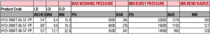 SAE 100 R8WT (TWIN THERMOPLASTIC HOSE) The Sunflex R8WT Twin Thermoplastic Hose is an all-purpose medium pressure hose meeting the same standards of SAE 100R8, suitable for many hydraulic and pneumatic systems. Compatible with hydraulic oils, grease, fuel oils, mineral oils and most phosphate esters. For water and water-based hydraulic fluids, temperature is limited to 70°C. This hose is also suitable for many industrial gasses: EG: Heliox (max 2.5% O2). Argon, Nitrogen, Carbon Dioxide, Helium and Air. • 4:1 Safety Factor • Excellent flexibility • Flex fatigue resistant throughout temperature range • Slim-lightweight technology • X Series fitting system